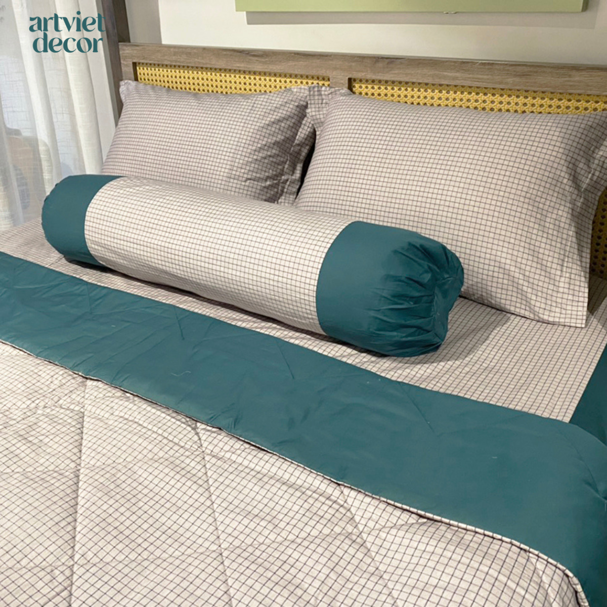 Bộ chăn ga gối Cotton Lụa hoạc tiết sọc phối xanh - LN.CLHQ011