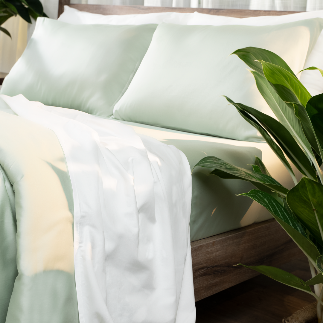 Bộ chăn ga gối Cotton satin màu xanh nhạt trơn có mật độ sợi vải TC400